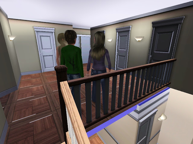 The hallway was rather roomy, and by the stairs you could see down to the first floor just like at Ian's. I love that house placement.